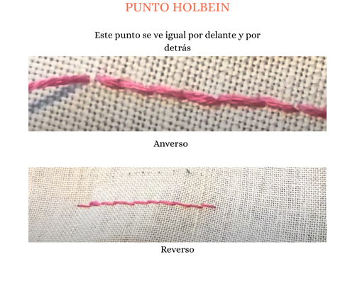 El punto Holbein, también conocido como punto doble o punto lineal reversible, es una técnica que permite crear líneas continuas, y perfectamente simétricas en el anverso y el reverso de la tela. Esto significa que tu bordado se verá impecable desde cualquier lado, algo que pocos puntos consiguen.